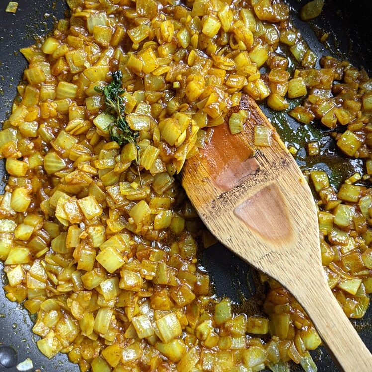 - Lower the temperature to medium (so you don’t burn the curry powder). Stir in the curry power to evenly distribute the spices throughout the oil and onions, allowing the spices to bloom for about 2 minutes. If the curry/onion mixture seems too dry, add some splashes of water so the curry doesn’t burn. Pour this curry, oil, onion and garlic mixture into a small bowl to be sure it does not cook any longer. Discard the thyme.