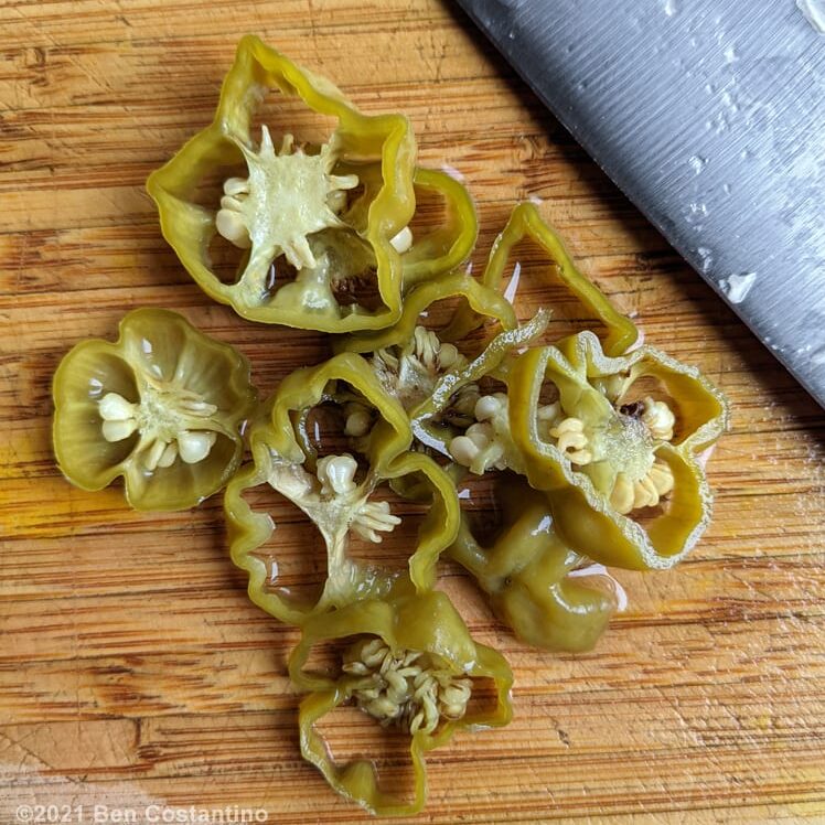 Scotch bonnet peppers sliced and stored in vinegar in the fridge.